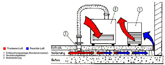 Über vereinzelte Bohrungen wird warme trockene Luft in die Isolierung unter den Estrich oder in die Hohlräume in Decke und Wand geblasen. Die trockene Luft nimmt Feuchtigkeit auf, tritt am Rand wieder aus und mit Hilfe von Kondenstrocknern wird der Raumluft die Feuchtigkeit wieder entzogen. Es entsteht ein Kreislauf, der sehr rasch und einfach die Spuren eines Wasserschadens beseitigt (geschlossenes System).